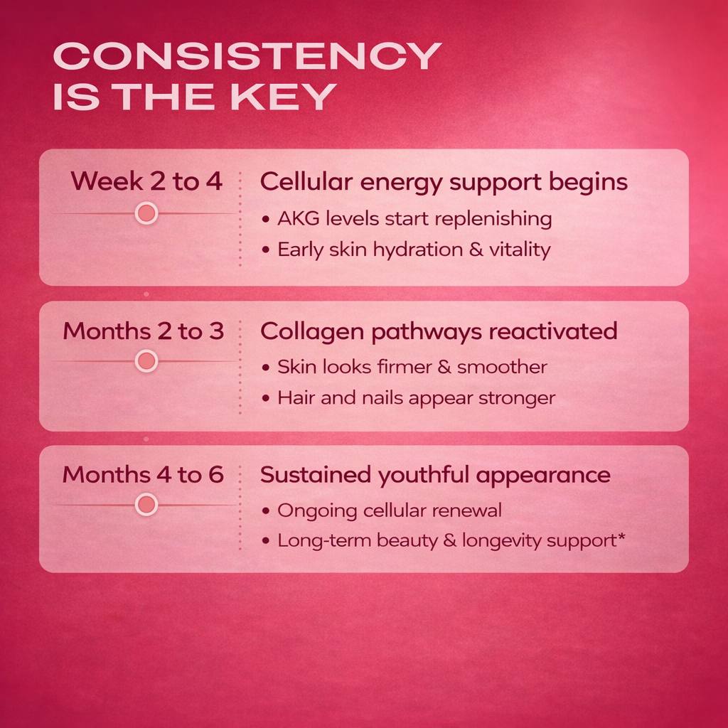 Your body begins replenishing declining AKG levels, supporting mitochondrial energy and cellular repair. Many users notice improved energy, better recovery, and early improvements in skin hydration and texture as internal processes activate.